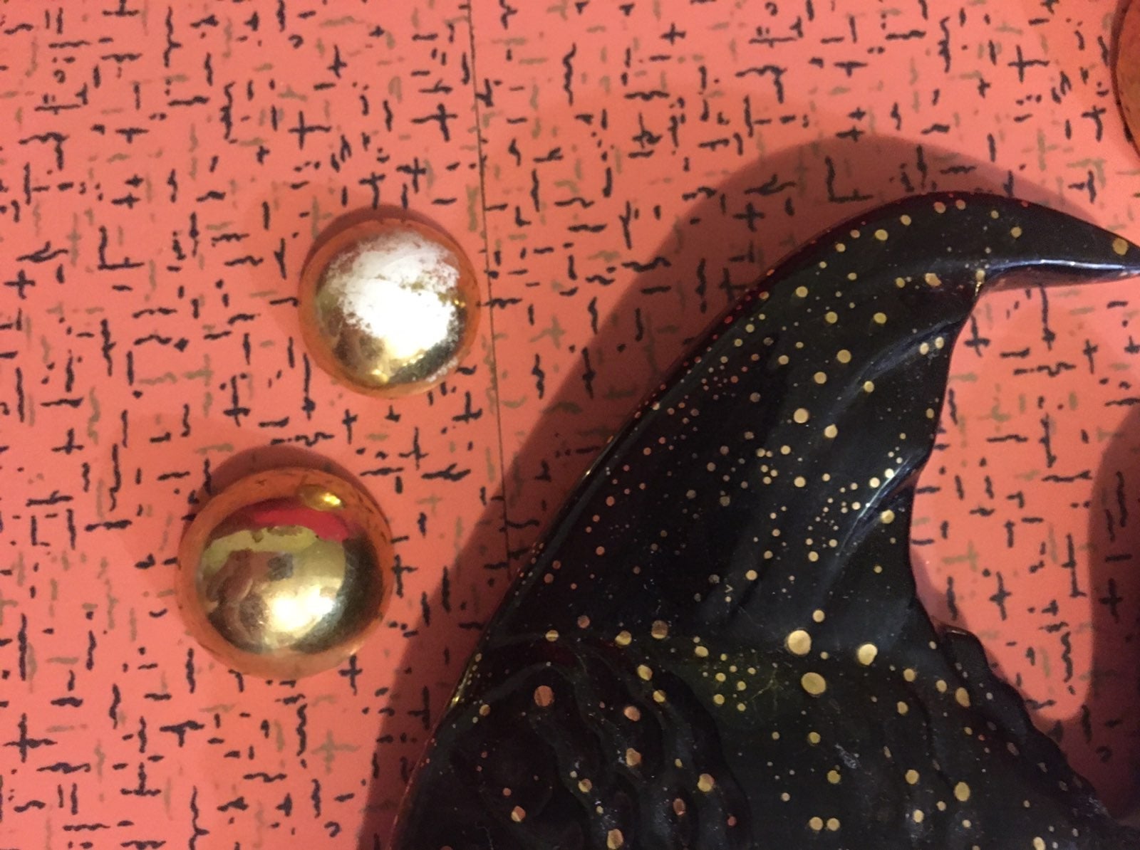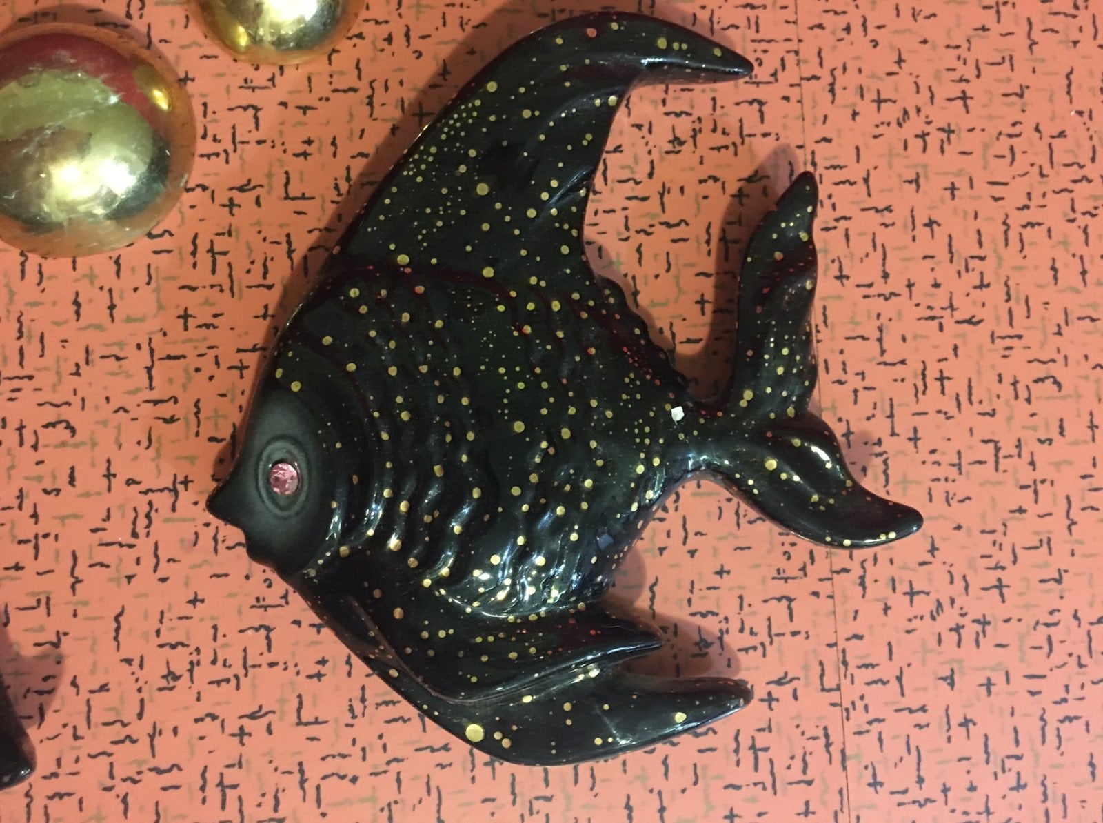 This mid century set of two ceramic angel fish is in perfect condition! They are black in color with gold dots, pink jeweled eyes and 5 gold bubbles. There is some paint loss on two of the smaller bubbles but that is the only thing wrong with this set.